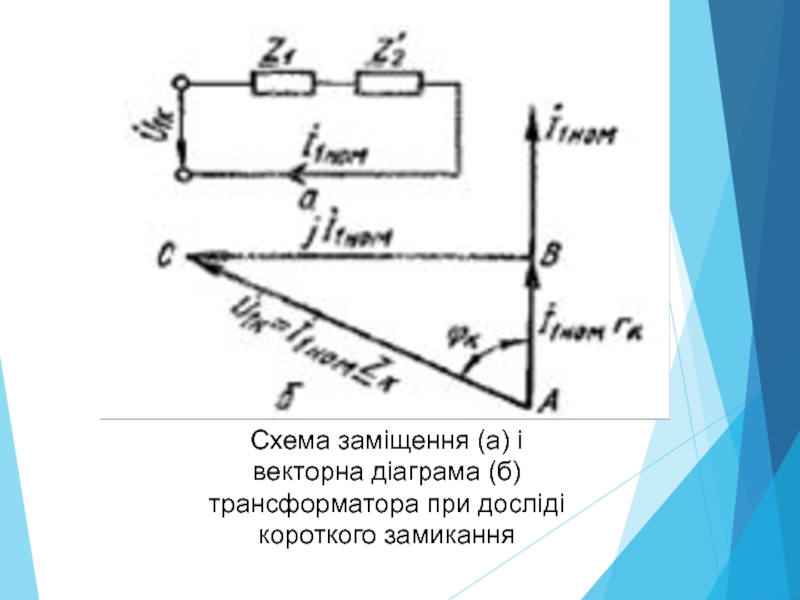 Слайд 32Схема заміщення (а) і векторна діаграма (б) трансформатора при досліді короткого