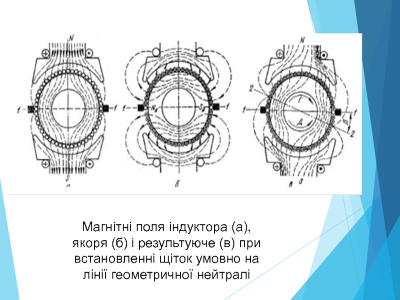 Слайд 14Магнітні поля індуктора (а), якоря (б) і результуюче (в) при