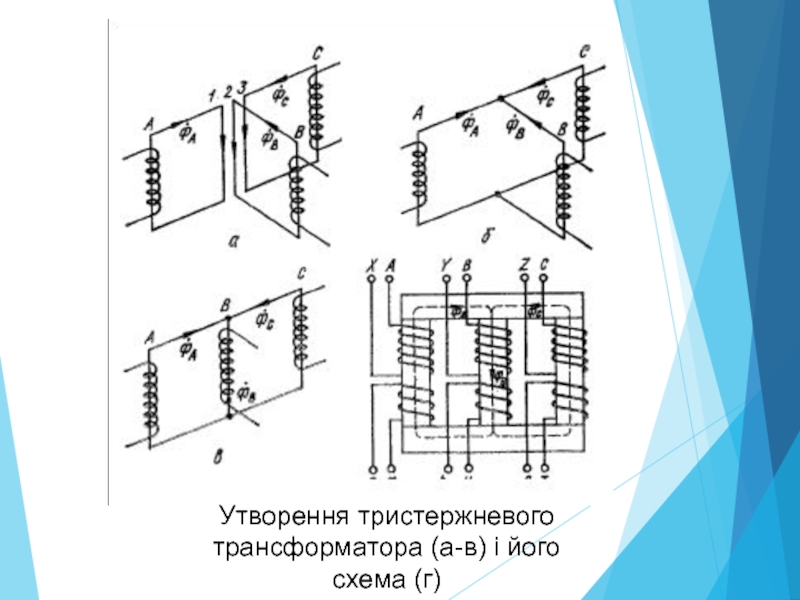 Слайд 35Утворення тристержневого трансформатора (а-в) і його схема (г)