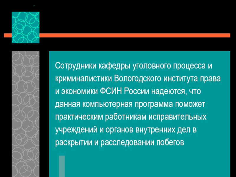 научно-исследовательской лаборатории (Беловым О.А., Морозовым Р.М., Шакировым С.В.) была разработана компьютерная программа «Методика расследования побегов из исправительных учреждений»