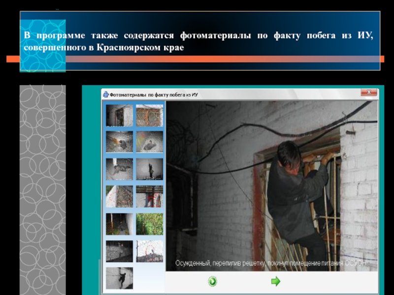 Слайд 6В программе также содержатся фотоматериалы по факту побега из ИУ, совершенного
