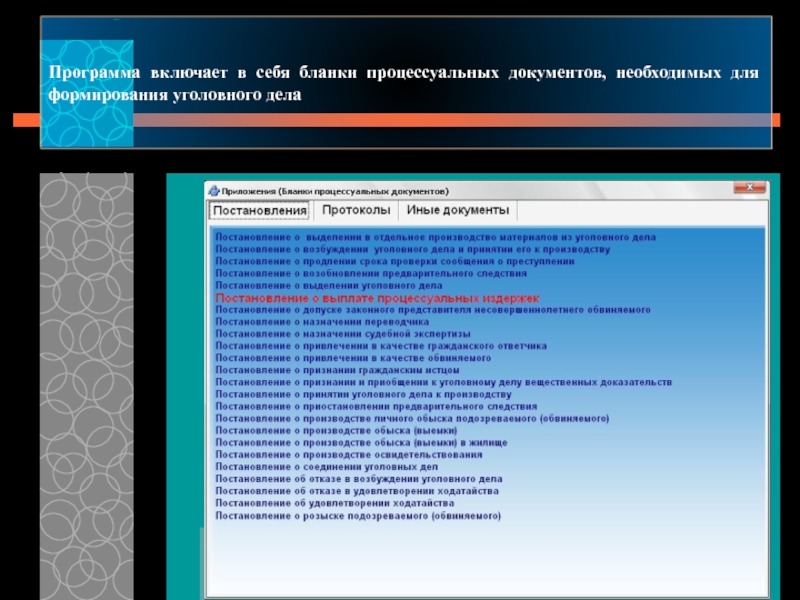 Слайд 5Программа включает в себя бланки процессуальных документов, необходимых для формирования уголовного