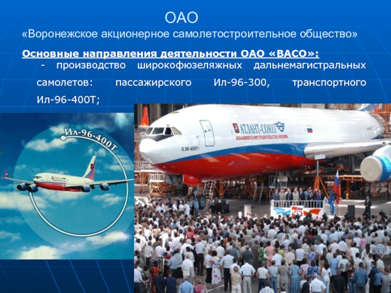 - производство широкофюзеляжных дальнемагистральных самолетов: пассажирского Ил-96-300, транспортного Ил-96-400Т;