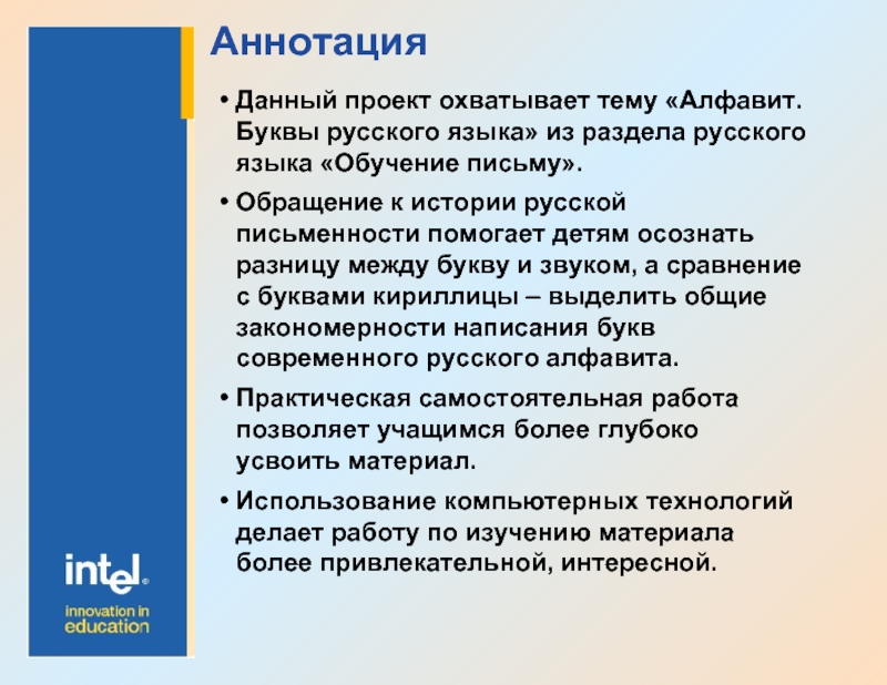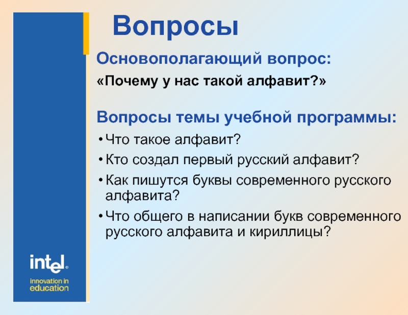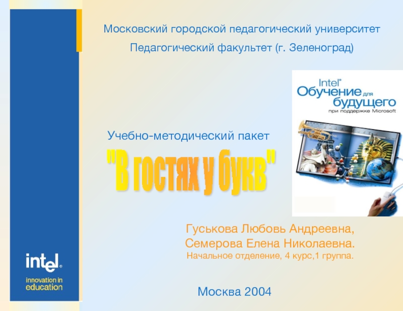 Выражаем благодарность Московскому городскому педагогическому университету, а также доц. Боровской Е.Р. и доц. Фатееву А.М. за предоставленную возможность окончить курсы Intel «Обучение для будущего».