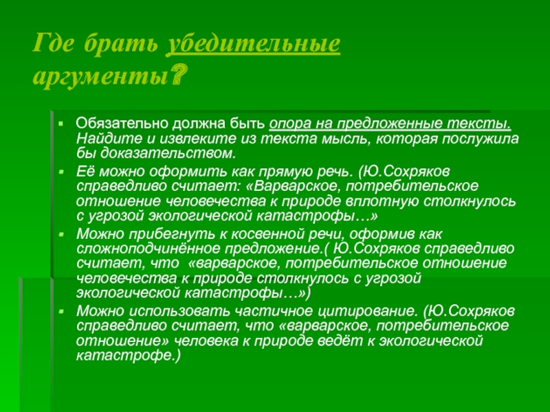 Тогда свою работу можно начать с формулировки тезиса: например, «В предложенной статье автором поднимается очень важная проблема – потребительское отношение человека к природе. Действительно…»