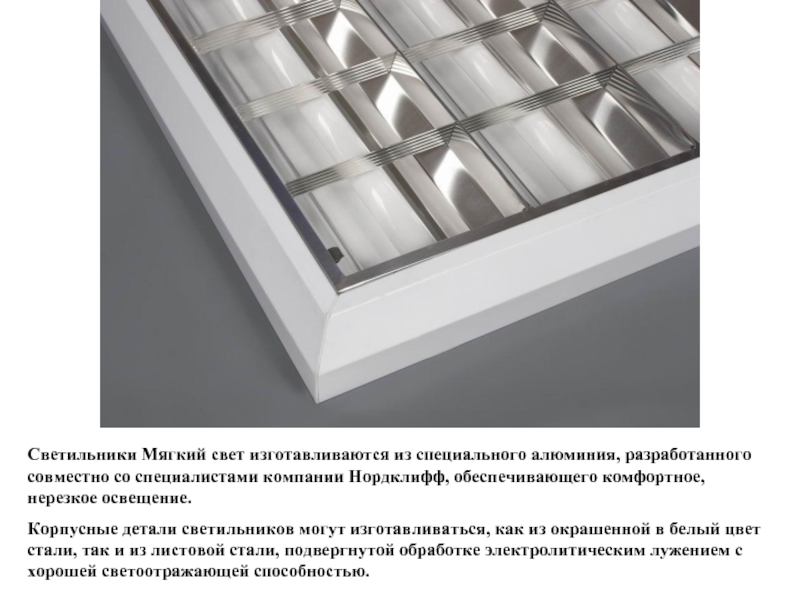 Слайд 14Светильники Мягкий свет изготавливаются из специального алюминия, разработанного совместно со специалистами