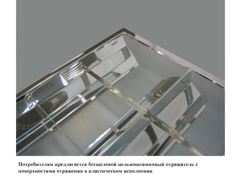 Слайд 12Потребителям предлагается бесщелевой цельноштамповый отражатель с поверхностями отражения в классическом исполнении