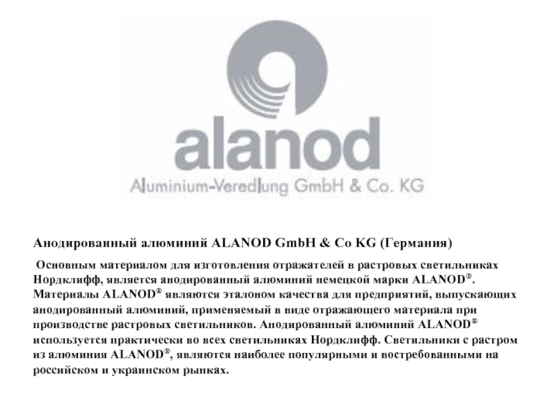 отражателей в растровых светильниках Нордклифф, является анодированный алюминий немецкой марки ALANOD®. Материалы ALANOD® являются эталоном качества для предприятий, выпускающих анодированный алюминий, применяемый в виде отражающего материала при производстве растровых светильников. Анодированный алюминий ALANOD® используется практически во всех светильниках Нордклифф. Светильники с растром из алюминия ALANOD®, являются наиболее популярными и востребованными на российском и украинском рынках.