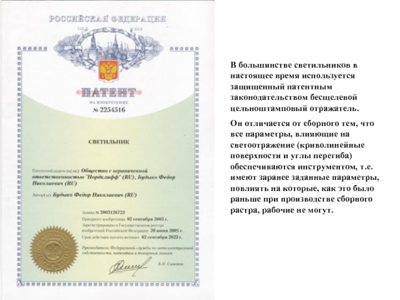 Слайд 10В большинстве светильников в настоящее время используется защищенный патентным законодательством бесщелевой