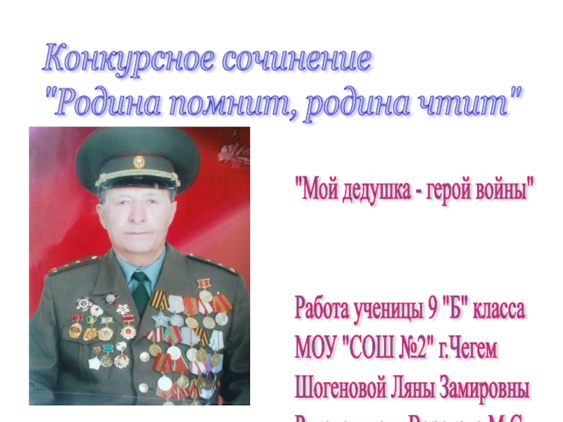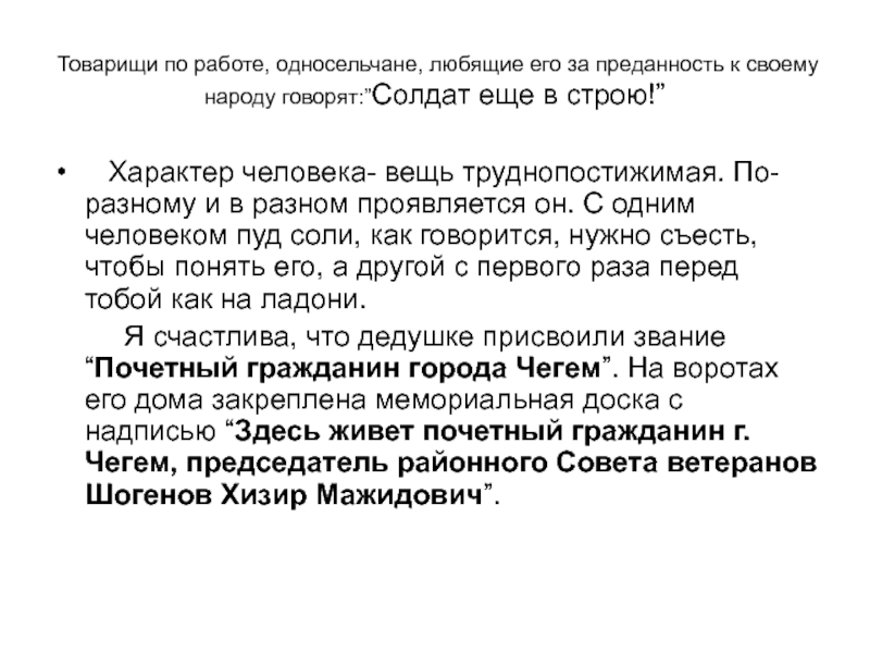 Я счастлива, что дедушке присвоили звание “Почетный гражданин города Чегем”. На воротах его дома закреплена мемориальная доска с надписью “Здесь живет почетный гражданин г.Чегем, председатель районного Совета ветеранов Шогенов Хизир Мажидович”.
