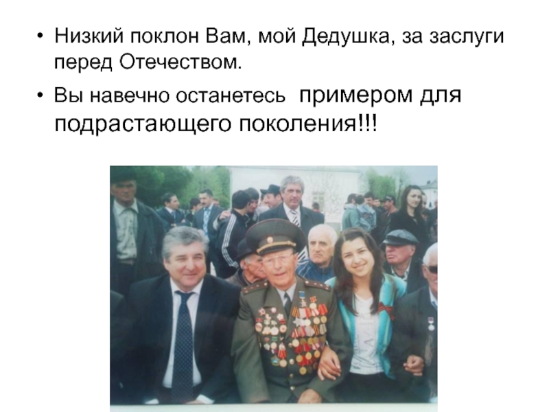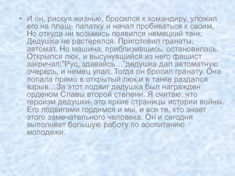 C дедушкой никогда не бывало ни тоскливо, ни тяжело. О таких людях говорят:”C ним можно и в огонь и в воду”. Безусловно, таким он был на фронте, когда, заслоняя собой своих товарищей, принял на грудь свинцовую пулю фашиста. Но и пуля его не одолела. Не одолели его и послевоенные тягости и трудности, активно участвуя в восстановлении разрушенного войной народного хозяйства. Он до конца жизни оставался моложавым и бодрым. И когда его спрашивали о том, как он себя чувствует, он отвечал:”Дай бог, чтобы в мои годы ты чувствовал себя так, как я чувствую”.