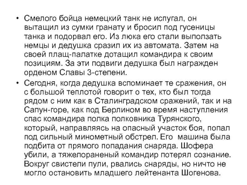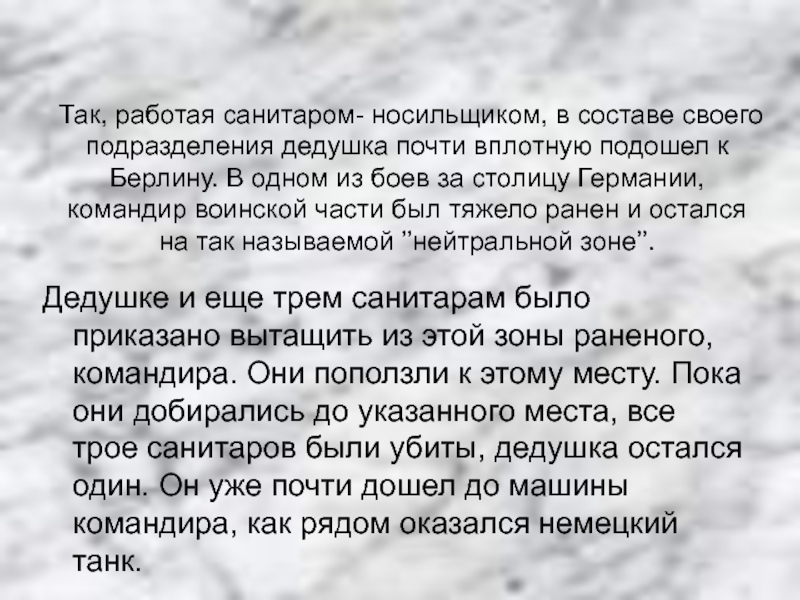 Дедушке и еще трем санитарам было приказано вытащить из этой зоны раненого, командира. Они поползли к этому месту. Пока они добирались до указанного места, все трое санитаров были убиты, дедушка остался один. Он уже почти дошел до машины командира, как рядом оказался немецкий танк.