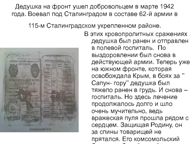В этих кровопролитных сражениях дедушка был ранен и отправлен в полевой госпиталь. По выздоровлении был снова в действующей армии. Теперь уже на южном фронте, которая освобождала Крым, в боях за ’’Сапун- гору’’ дедушка был тяжело ранен в грудь. И снова – госпиталь. Но здесь лечение продолжалось долго и шло очень мучительно, ведь вражеская пуля прошла рядом с сердцем. Защищая Родину, он за спины товарищей не прятался. Его комсомольский билет, пробитый пулей, хранится как реликвия в Республиканском краеведческом музее.