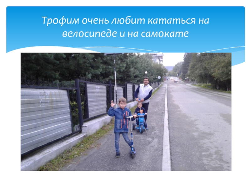 Слайд 7Трофим очень любит кататься на велосипеде и на самокате