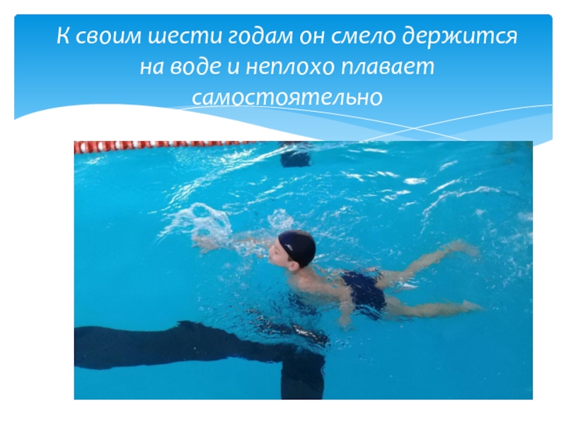 Слайд 3К своим шести годам он смело держится на воде и неплохо