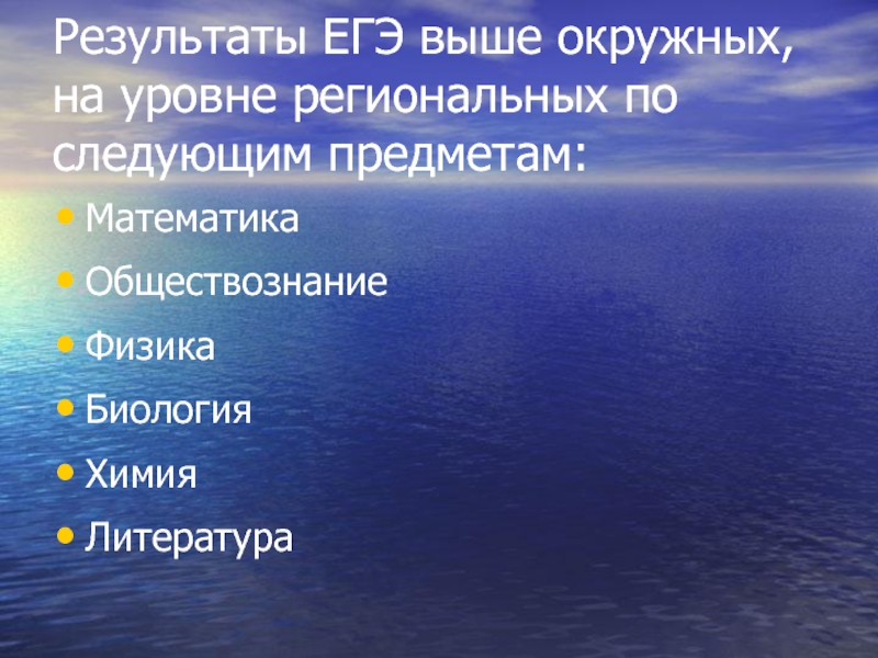 Слайд 6Результаты ЕГЭ выше окружных, на уровне региональных по следующим предметам:
