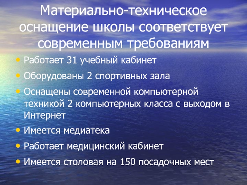 Слайд 2Материально-техническое оснащение школы соответствует современным требованиям