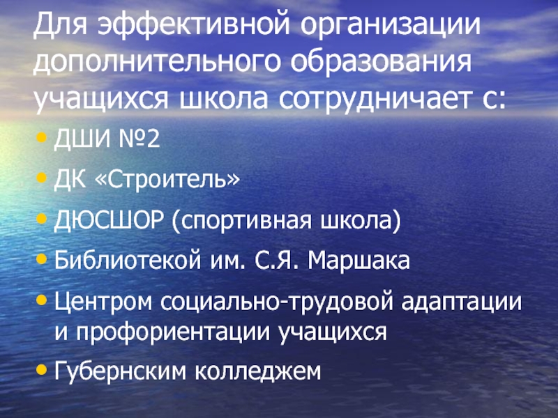 Слайд 12Для эффективной организации дополнительного образования учащихся школа сотрудничает с:
