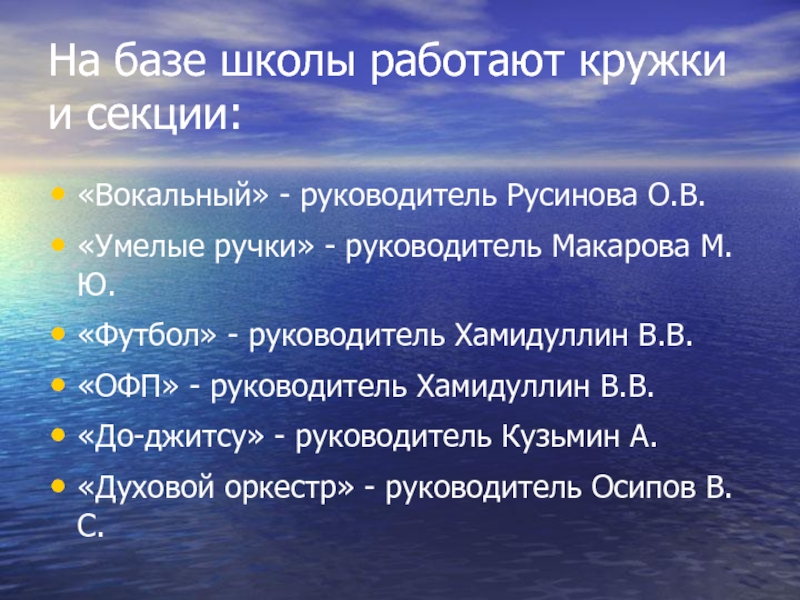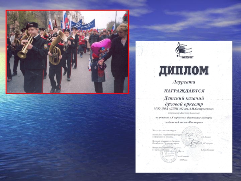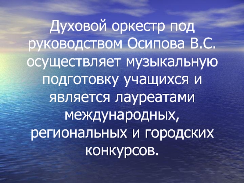 Слайд 14Духовой оркестр под руководством Осипова В.С. осуществляет музыкальную подготовку учащихся и