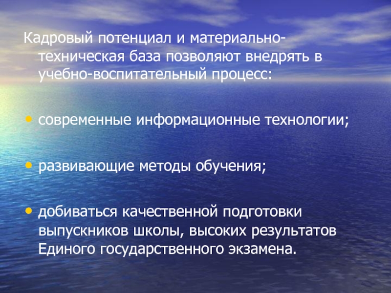 Слайд 4Кадровый потенциал и материально-техническая база позволяют внедрять в учебно-воспитательный процесс: