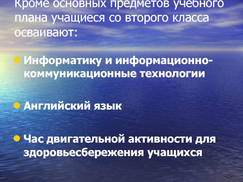 Слайд 11Кроме основных предметов учебного плана учащиеся со второго класса осваивают: