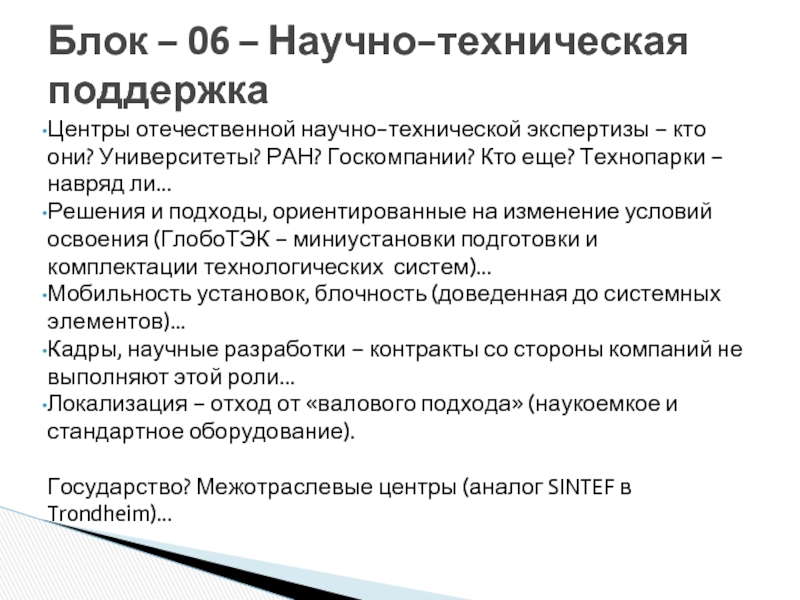 Блок – 06 – Научно-техническая поддержка