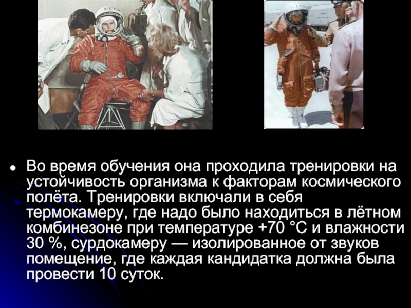 факторам космического полёта. Тренировки включали в себя термокамеру, где надо было находиться в лётном комбинезоне при температуре +70 °C и влажности 30 %, сурдокамеру — изолированное от звуков помещение, где каждая кандидатка должна была провести 10 суток.