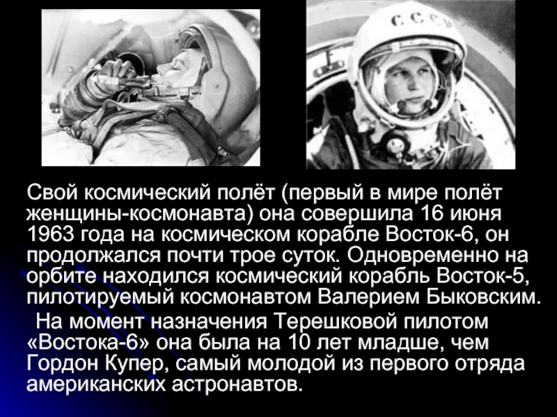 женщины-космонавта) она совершила 16 июня 1963 года на космическом корабле Восток-6, он продолжался почти трое суток. Одновременно на орбите находился космический корабль Восток-5, пилотируемый космонавтом Валерием Быковским.