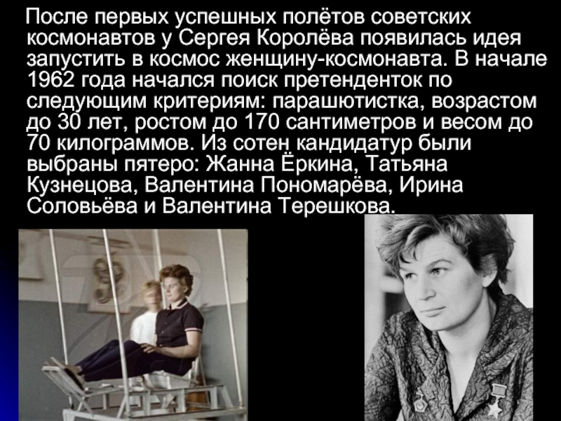 Королёва появилась идея запустить в космос женщину-космонавта. В начале 1962 года начался поиск претенденток по следующим критериям: парашютистка, возрастом до 30 лет, ростом до 170 сантиметров и весом до 70 килограммов. Из сотен кандидатур были выбраны пятеро: Жанна Ёркина, Татьяна Кузнецова, Валентина Пономарёва, Ирина Соловьёва и Валентина Терешкова.