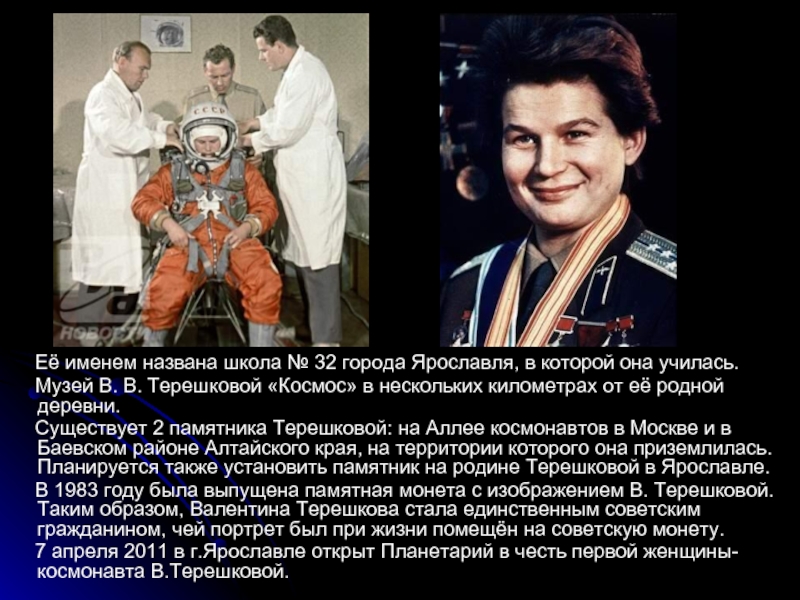7 апреля 2011 в г.Ярославле открыт Планетарий в честь первой женщины-космонавта В.Терешковой.