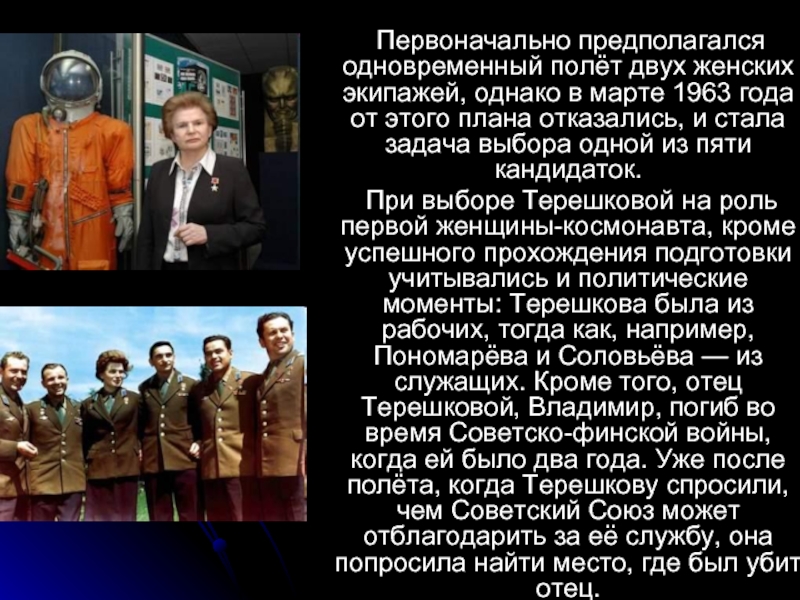 Слайд 9 Первоначально предполагался одновременный полёт двух женских экипажей, однако