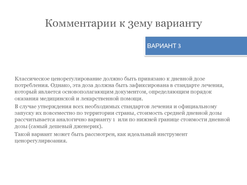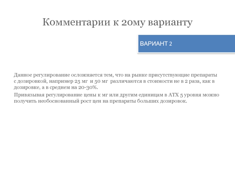 Цена привязывается либо к дневной дозе, либо к количеству мг / единиц. В России пока нельзя реализовать в полной мере, т.к. дневная доза представлена в стандарте лечения (пока официально не утверждены). Привязать к мг/ единицам вообще не получится, т.к. препарат в 25мг и 50 мг на практике в цене различается всего на 10-30%, а не в 2 раза, как в дозировке