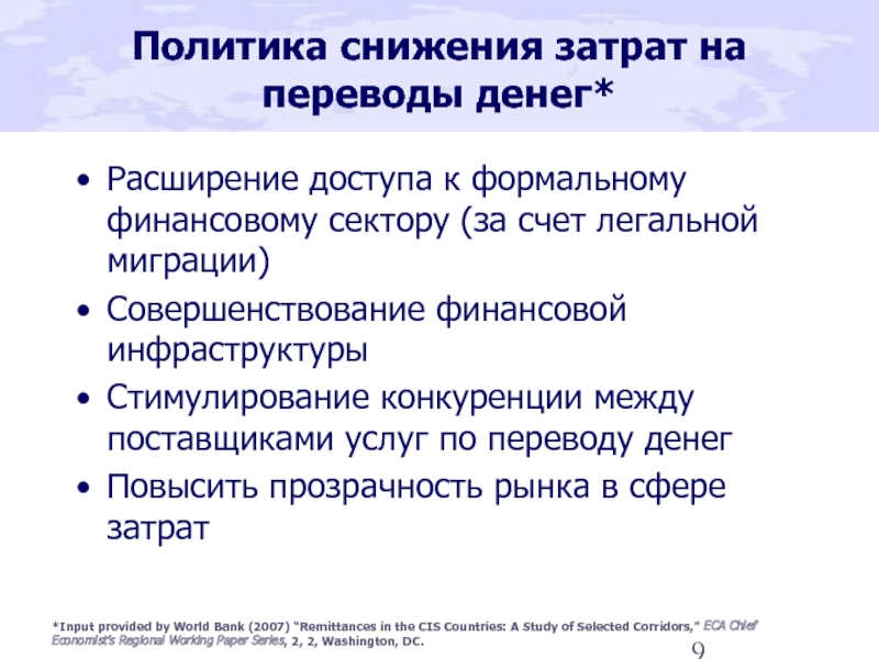 *Input provided by World Bank (2007) “Remittances in the CIS Countries: A Study of Selected Corridors,” ECA Chief Economist’s Regional Working Paper Series, 2, 2, Washington, DC.