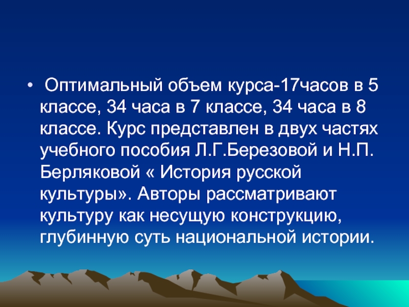 классе, 34 часа в 8 классе. Курс представлен в двух частях учебного пособия Л.Г.Березовой и Н.П. Берляковой « История русской культуры». Авторы рассматривают культуру как несущую конструкцию, глубинную суть национальной истории.