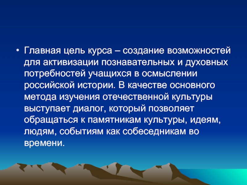 потребностей учащихся в осмыслении российской истории. В качестве основного метода изучения отечественной культуры выступает диалог, который позволяет обращаться к памятникам культуры, идеям, людям, событиям как собеседникам во времени.