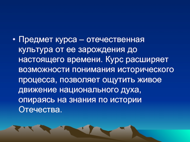 Предмет курса – отечественная культура от ее зарождения до настоящего времени.