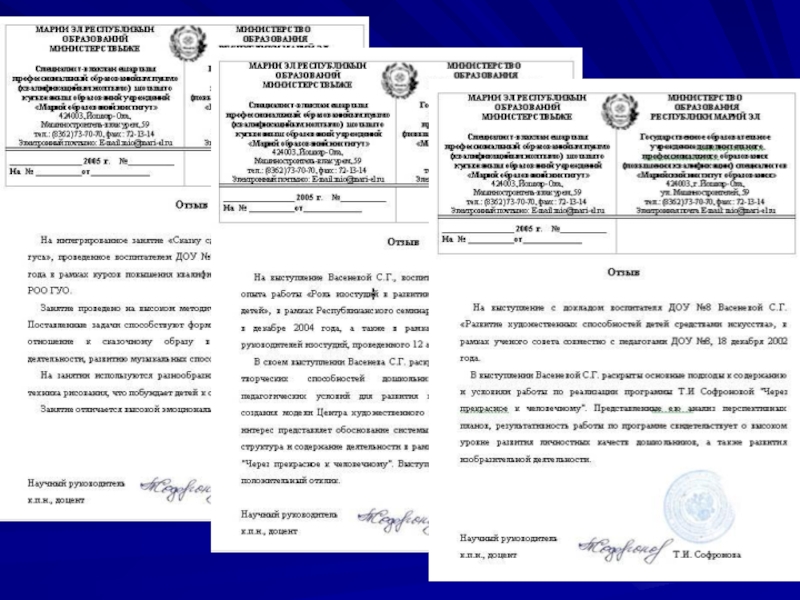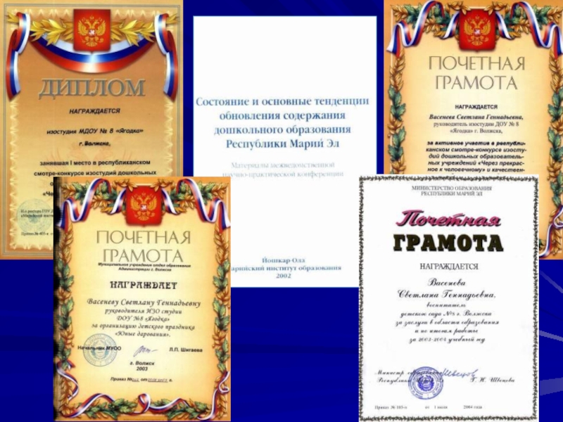 Почетной грамотой ГОУ ДПО (ПК) С «Марийский институт образования», приказ № 405-К от 24.11.2004.