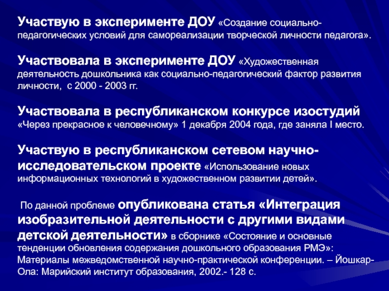 Участвовала в эксперименте ДОУ «Художественная деятельность дошкольника как социально-педагогический фактор развития личности, с 2000 - 2003 гг.