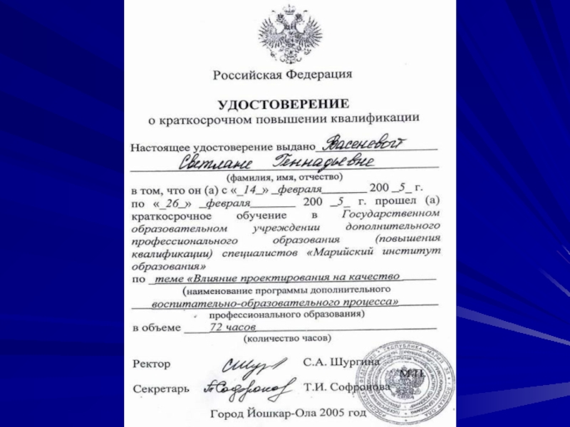 Курсы повышения квалификации: ГОУ ДПО (ПК) С «Марийский институт образования» по теме «Влияние проектирования на качество воспитательно-образовательного процесса», 2005 год, удостоверение № 145.