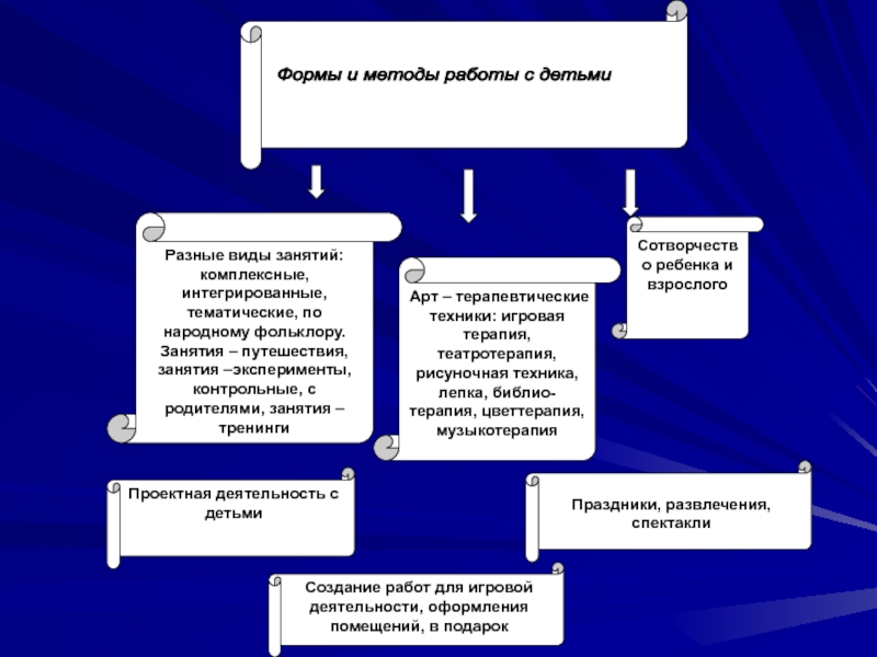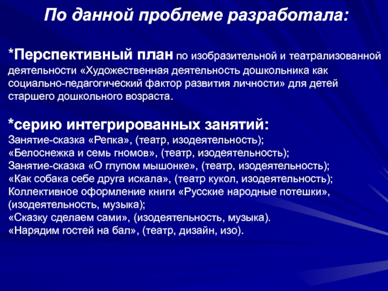 лепить из соленого теста»? «Театр как средство для развития творческих способностей ребенка», «Как изготовить маски?», «Какие качества личности развиваются в совместной деятельности детей со сверстниками и взрослыми?», «Арт-терапия как метод для реализации потенциальных творческих, уникальных, зачастую скрытых, возможностей ребенка», «Развитие изобразительной деятельности в других видах детской деятельности»).