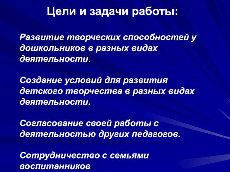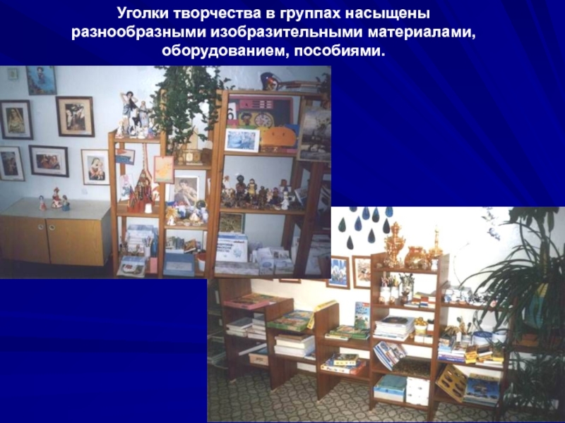Слайд 17Уголки творчества в группах насыщены разнообразными изобразительными материалами, оборудованием, пособиями.