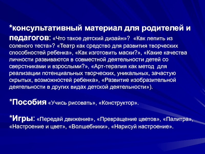Слайд 5*консультативный материал для родителей и педагогов: «Что такое детский дизайн»? «Как
