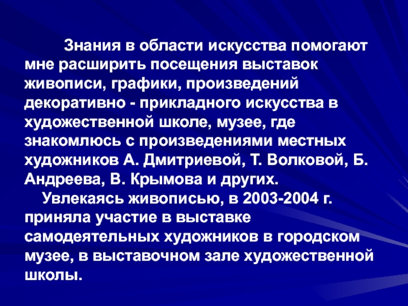 расширить посещения выставок живописи, графики, произведений декоративно - прикладного искусства в художественной школе, музее, где знакомлюсь с произведениями местных художников А. Дмитриевой, Т. Волковой, Б. Андреева, В. Крымова и других.