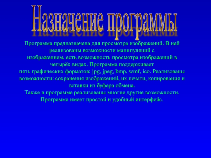 с изображением, есть возможность просмотра изображений в четырёх видах. Программа поддерживает пять графических форматов: jpg, jpeg, bmp, wmf, ico. Реализованы возможности: сохранения изображений, их печати, копирования и вставки из буфера обмена. Также в программе реализованы многие другие возможности. Программа имеет простой и удобный интерфейс.