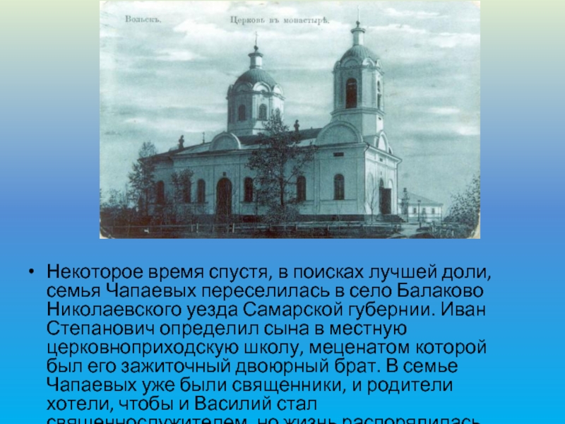 В 1908 году Чапаев познакомился с 16-летней Пелагеей Метлиной и в том же году женился на ней. Вместе они прожили 6 лет, у них родилось трое детей. Затем началась Первая мировая война, и Чапаев ушёл на фронт. Пелагея пожила в доме его родителей, потом ушла вместе с детьми. В начале 1917 года Чапаев заехал в родные места, забрал у Пелагеи детей и вернул их в дом родителей. Вскоре от ран умер его товарищ Пётр Кишкерцев, и Чапаев, согласно их уговору, взял на воспитание его дочерей Олимпиаду и Веру.