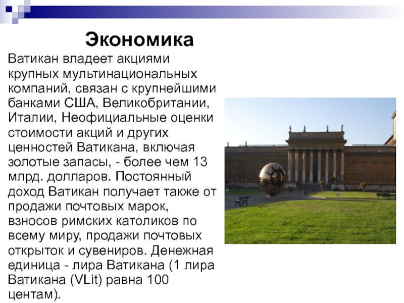 Великобритании, Италии, Неофициальные оценки стоимости акций и других ценностей Ватикана, включая золотые запасы, - более чем 13 млрд. долларов. Постоянный доход Ватикан получает также от продажи почтовых марок, взносов римских католиков по всему миру, продажи почтовых открыток и сувениров. Денежная единица - лира Ватикана (1 лира Ватикана (VLit) равна 100 центам).