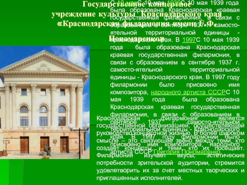 Краснодарская филармония является государственной организацией, осуществляющей руководство концертной жизнью. В более широком смысле – это связующее звено между теми, кто создает концерты, и теми, кто их посещает. Филармония изучает вкусы, эстетические потребности зрительской аудитории, стремится удовлетворить их за счет местных творческих и приглашенных исполнителей.