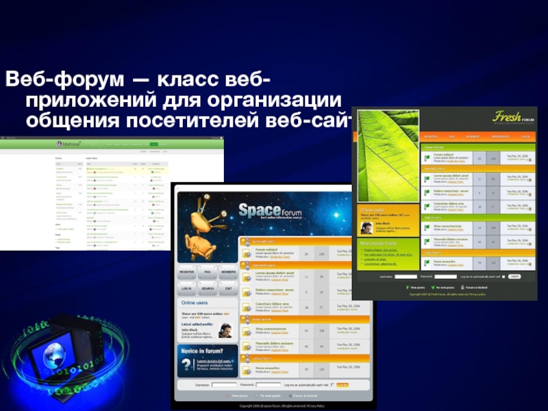 Слайд 2Веб-форум — класс веб-приложений для организации общения посетителей веб-сайта.