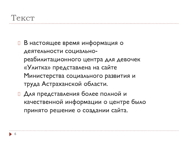 Информация о деятельности социально-реабилитационного центра для девочек «Улитка»