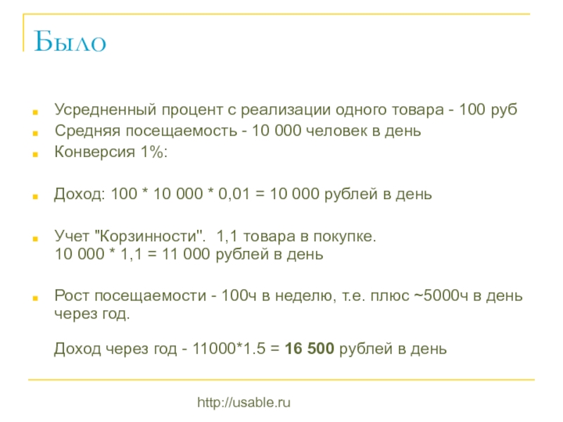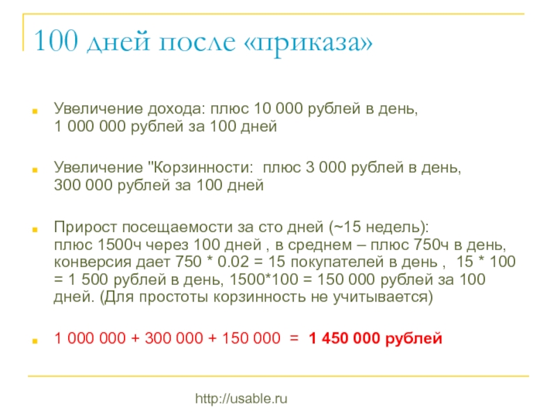 плюс 1500ч через 100 дней , в среднем – плюс 750ч в день, конверсия дает 750 * 0.02 = 15 покупателей в день , 15 * 100 = 1 500 рублей в день, 1500*100 = 150 000 рублей за 100 дней. (Для простоты корзинность не учитывается)